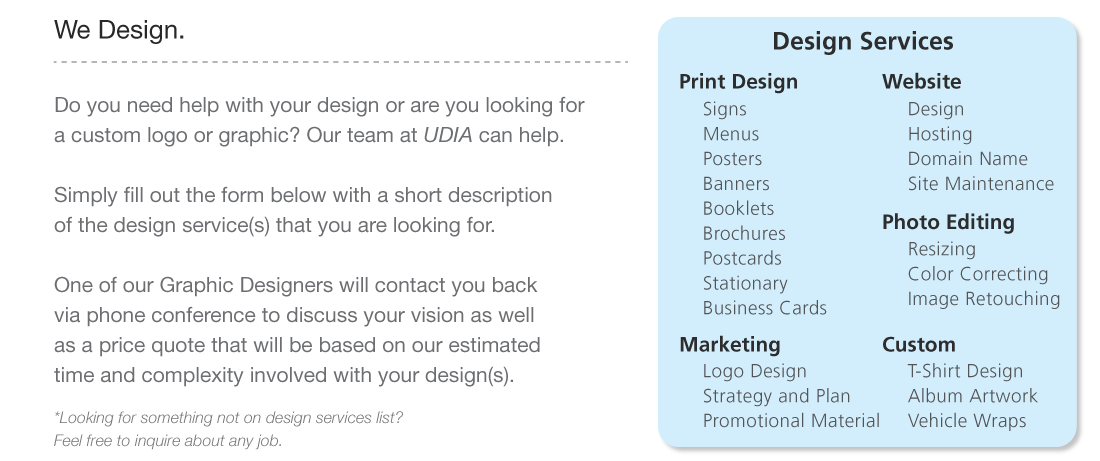 Please select a service below. Signs Menus Posters Banners Booklets Brochures Postcards Stationary Business Cards Logo Design Design Marketing Plan Promostional Items Website Design Website Hosting Domain Name Site Maintenance Photo Resizing Photo Color Correction Image Retouching T-Shirt Design Album Artwork Vehicle Wrap Other. Please give us a short description of the design service(s) you are looking for.